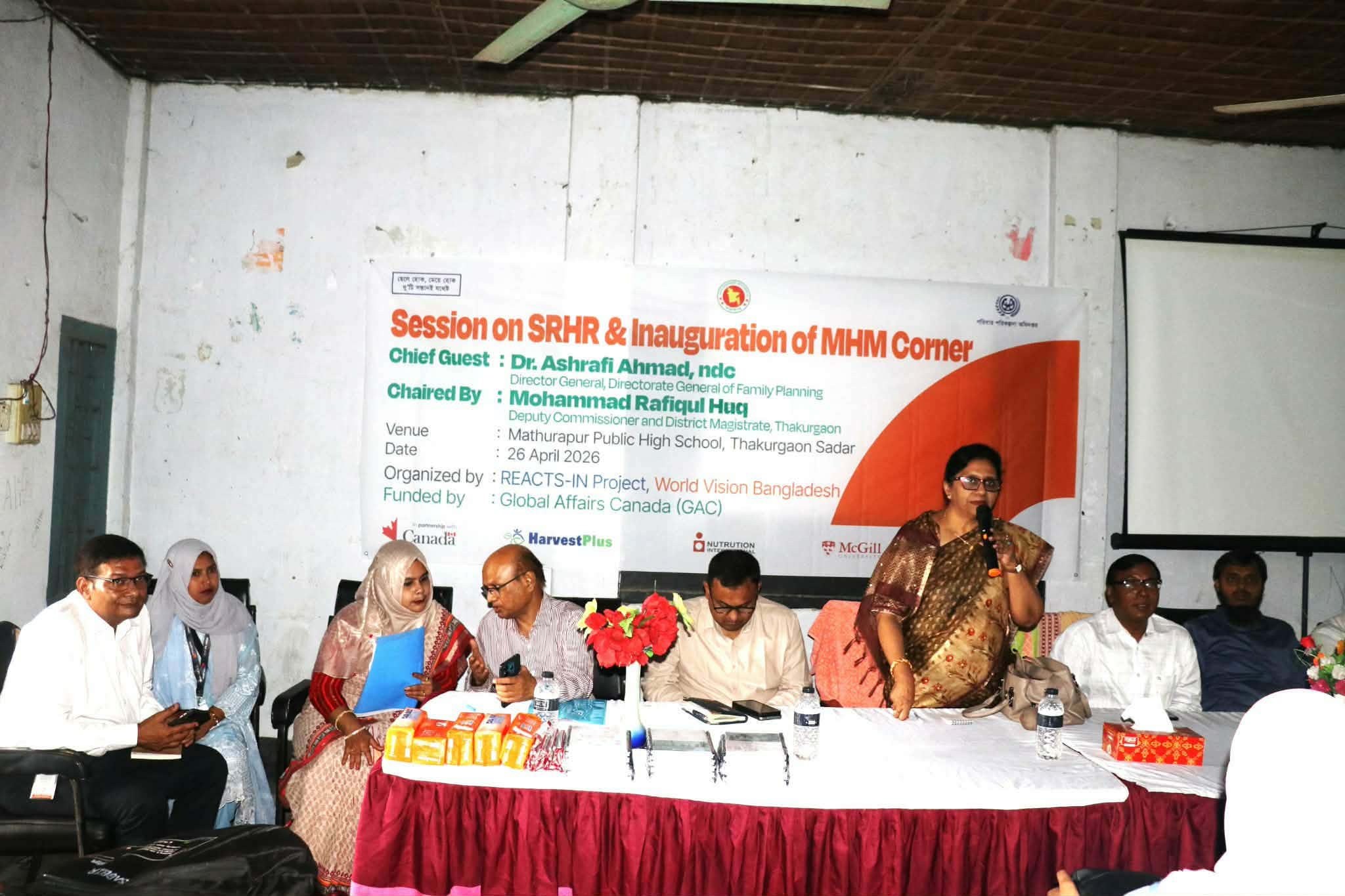 মিনিস্ট্রাল হাইজিন ব্যবস্থাপনা কর্নারের, শুভ উদ্বোধন করেন, পরিবার পরিকল্পনা মহাপরিচালক ডাঃ আশরাফী আহমেদ,আরও উপস্থিত ছিলেন উপজেলা পরিবার পরিকল্পনা কর্মকর্তা, নাদিয়া আক্তার, ওয়ার্ল্ড ভিশন বাংলাদেশ রিয়্যাক্টস ইন প্রকল্পের প্রকল্প অফিসার মারুফা খাতুন, সহ প্রমুখ,